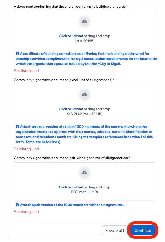 Upload the requested attachments in the correct format and size, and click continue to proceed