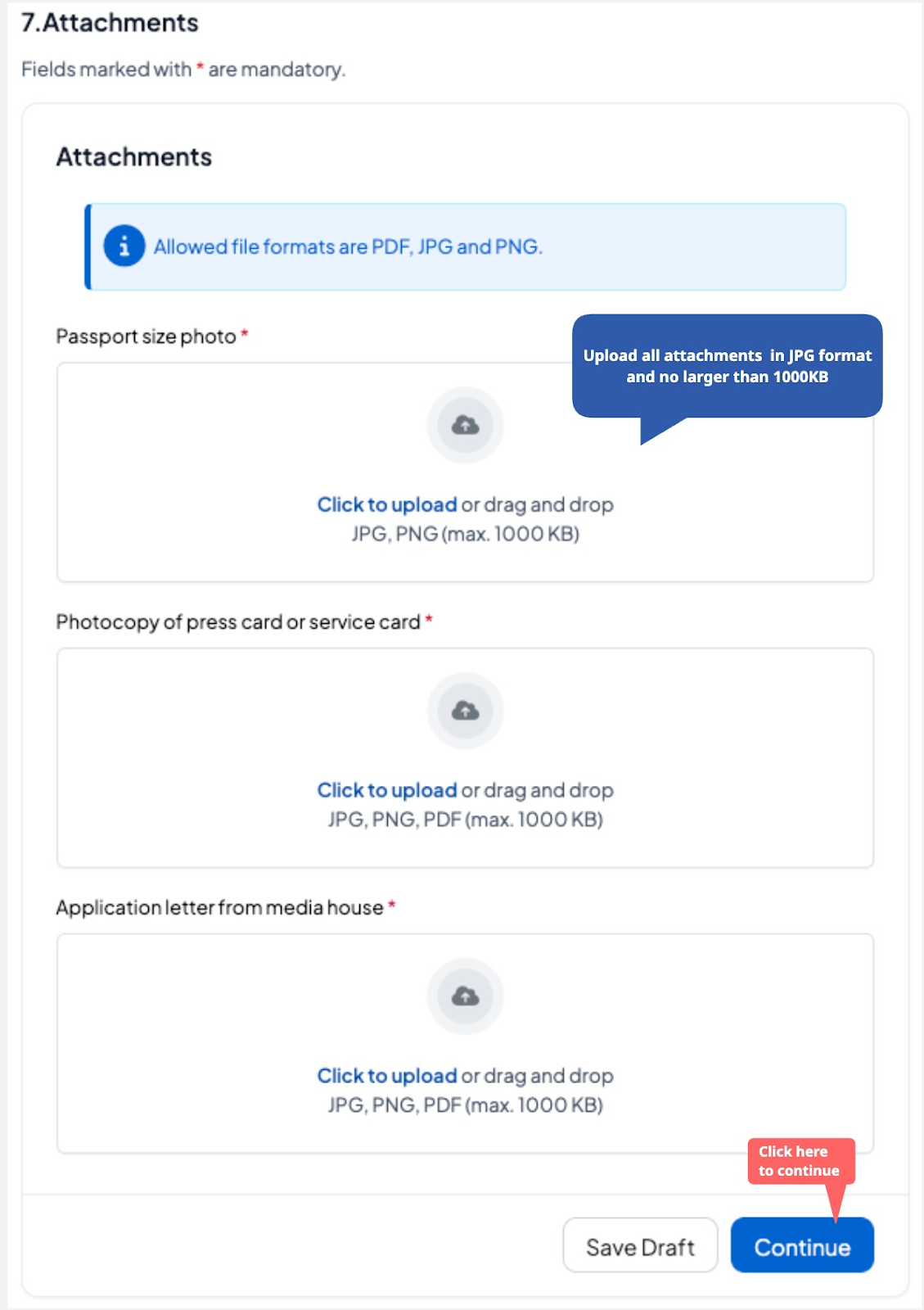 attach the required documents in the right format and size. Click continue to proceed.