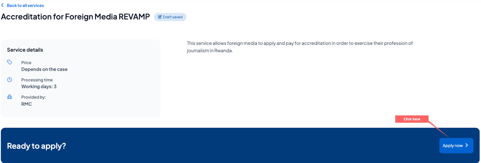 This service allows foreign media (Rwandan correspondents, EAC journalists, and foreign journalists) to apply and pay for accreditation in order to exercise their profession of journalism in Rwanda.
