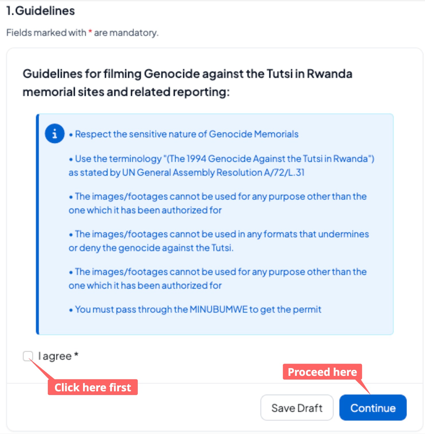 Carefully read the Guidelines for Filming the Genocide Against the Tutsi in Rwanda Memorial Sites, check the box to agree, and click Continue to proceed. The application can NOT continue unless you agree to these terms.