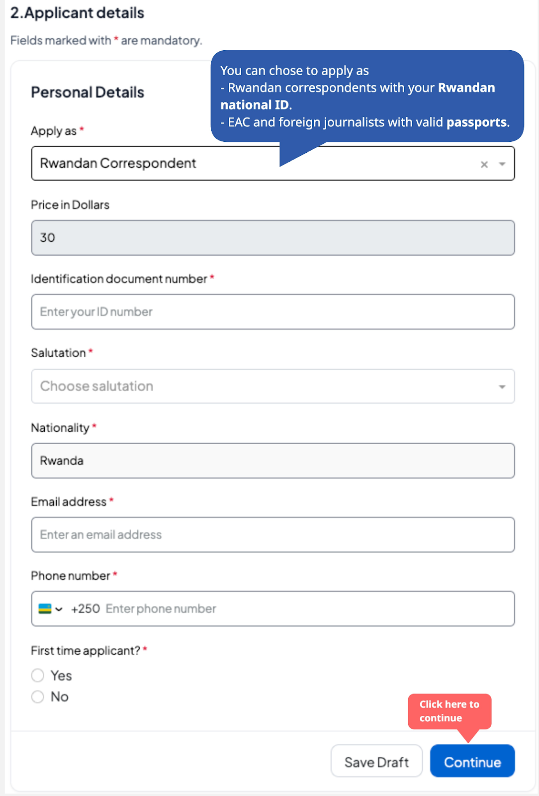 Rwandan correspondents should have a national ID number, while foreign journalists should have a valid passport number.