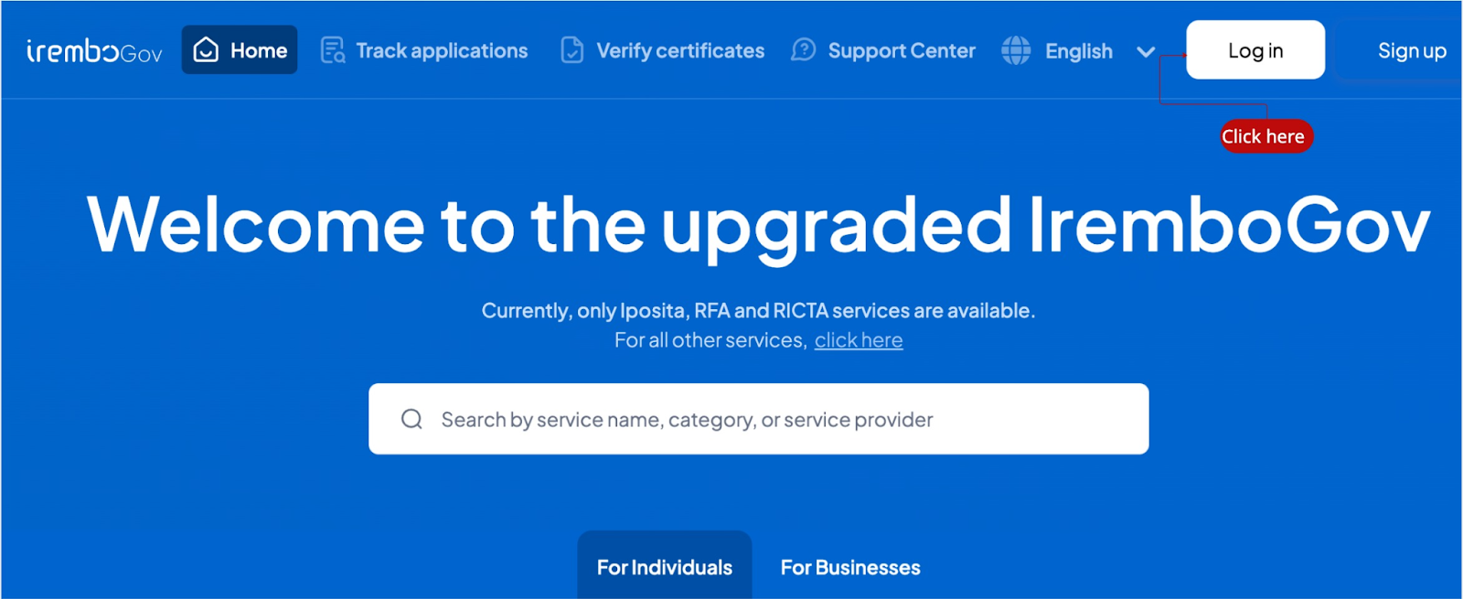 Visit new.irembo.gov.rw and log in to your Irembo account. If you don’t have one, click here to learn how to create it.