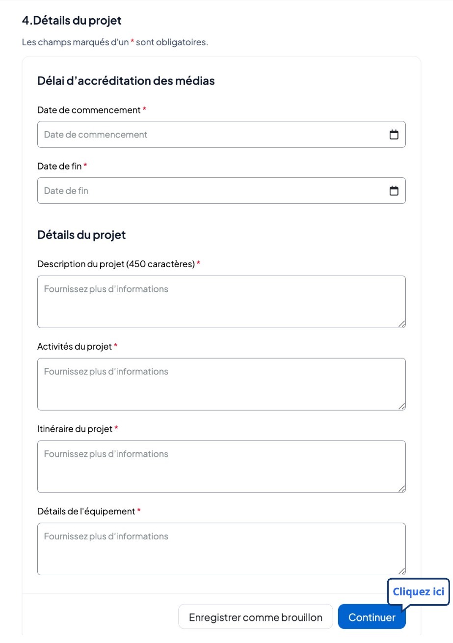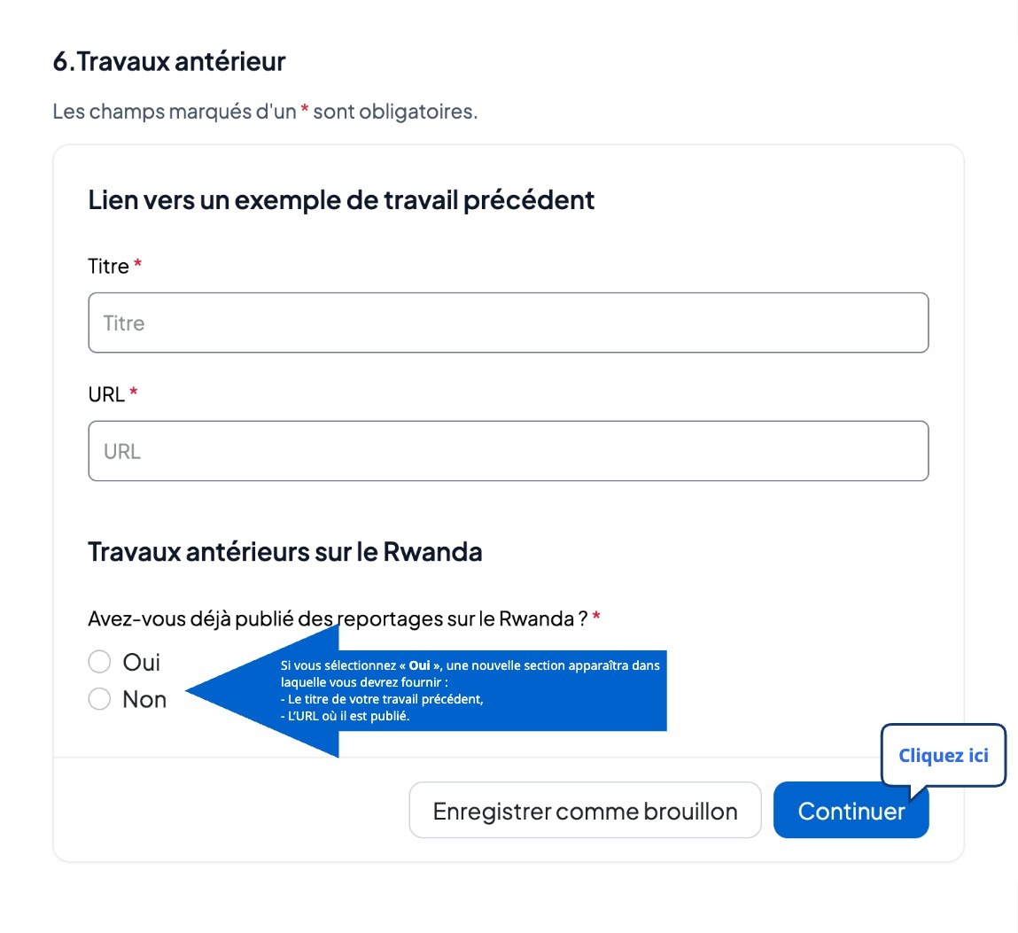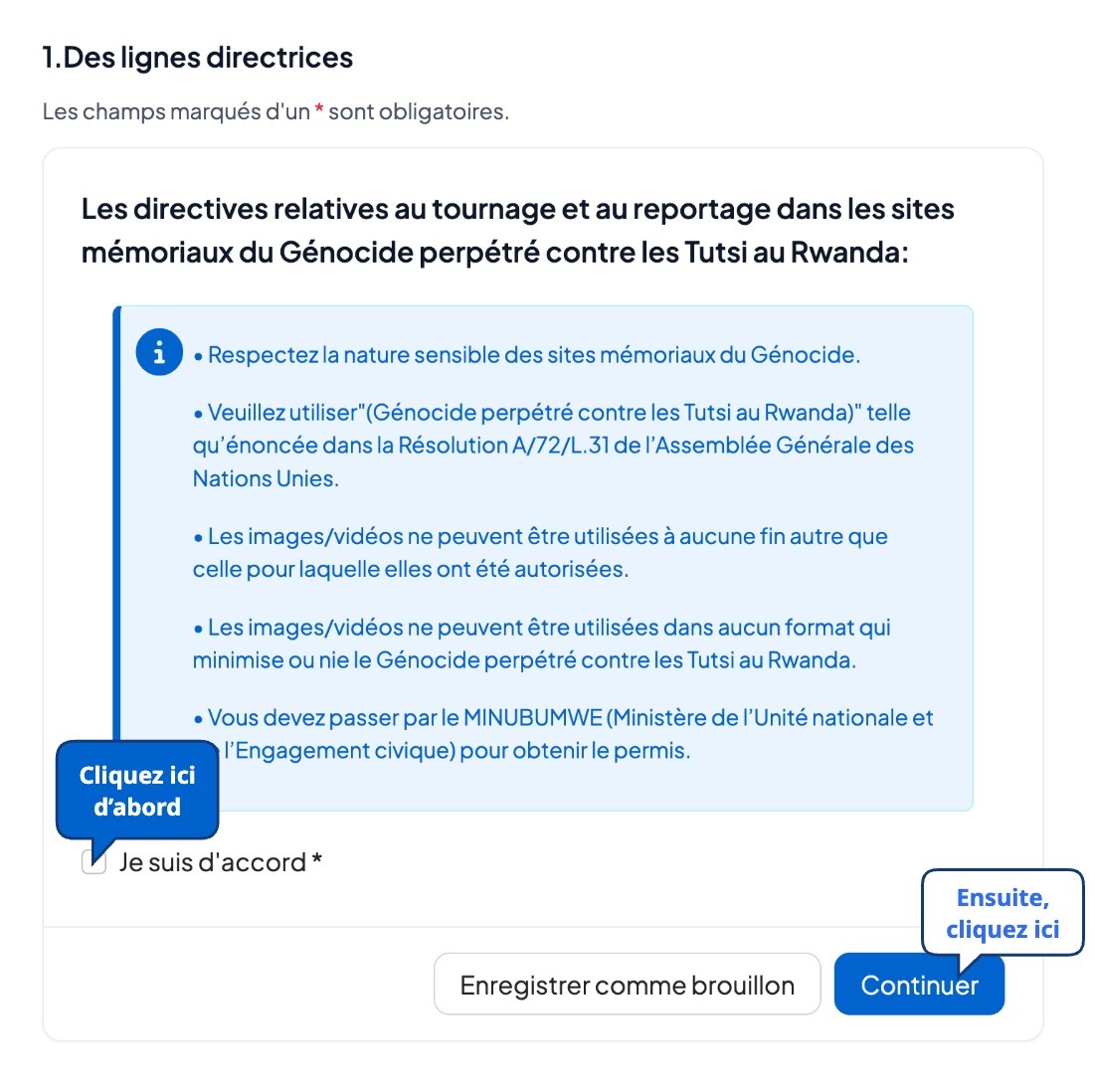 Lisez attentivement les Lignes directrices pour le tournage sur les sites mémoriaux du Génocide perpétré contre les Tutsi au Rwanda, cochez la case pour accepter et cliquez sur Continuer pour poursuivre. Vous devez accepter ces conditions pour pouvoir poursuivre la demande.