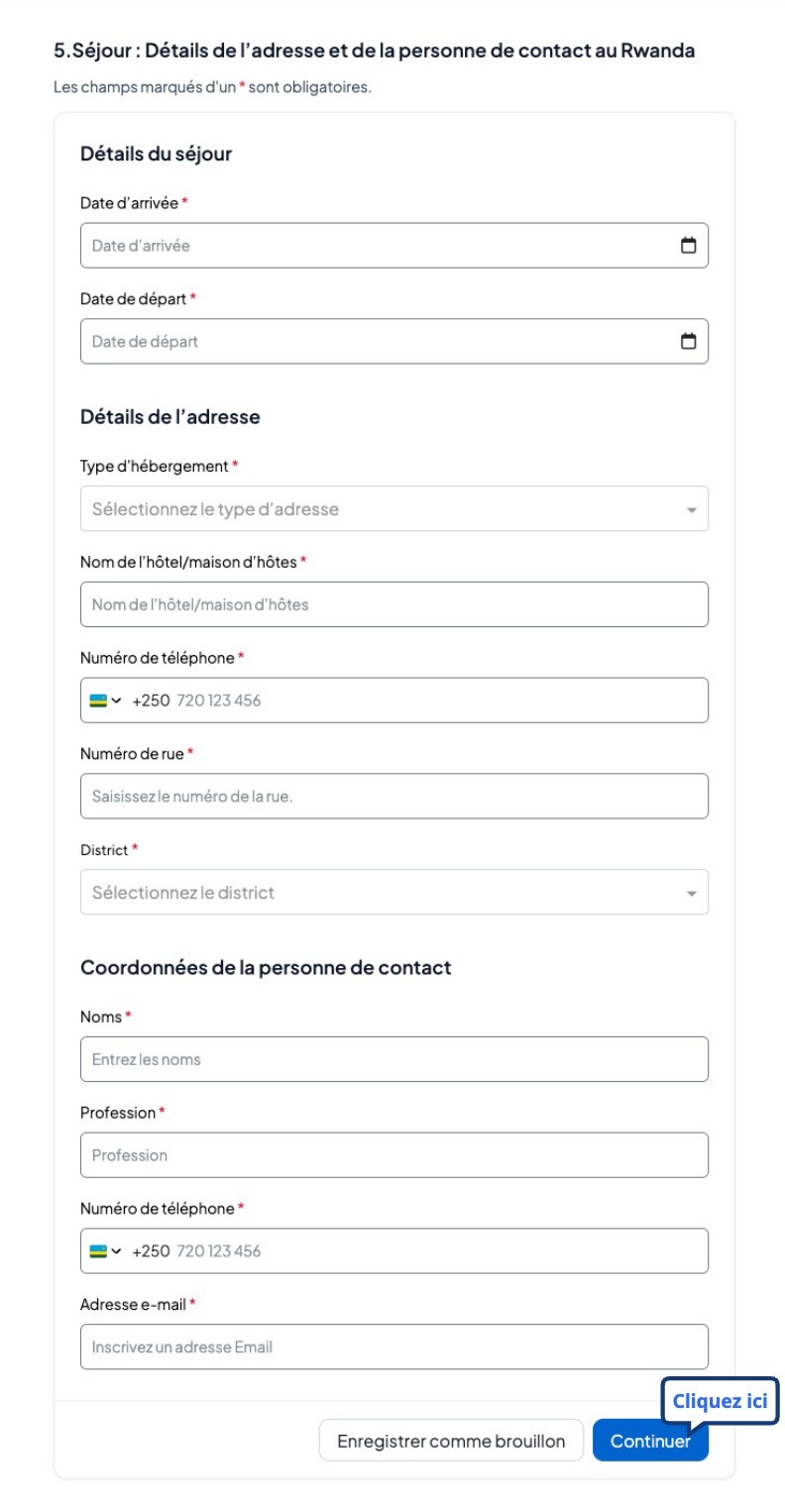 Saisissez les détails de l’adresse et de la personne de contact au Rwanda.