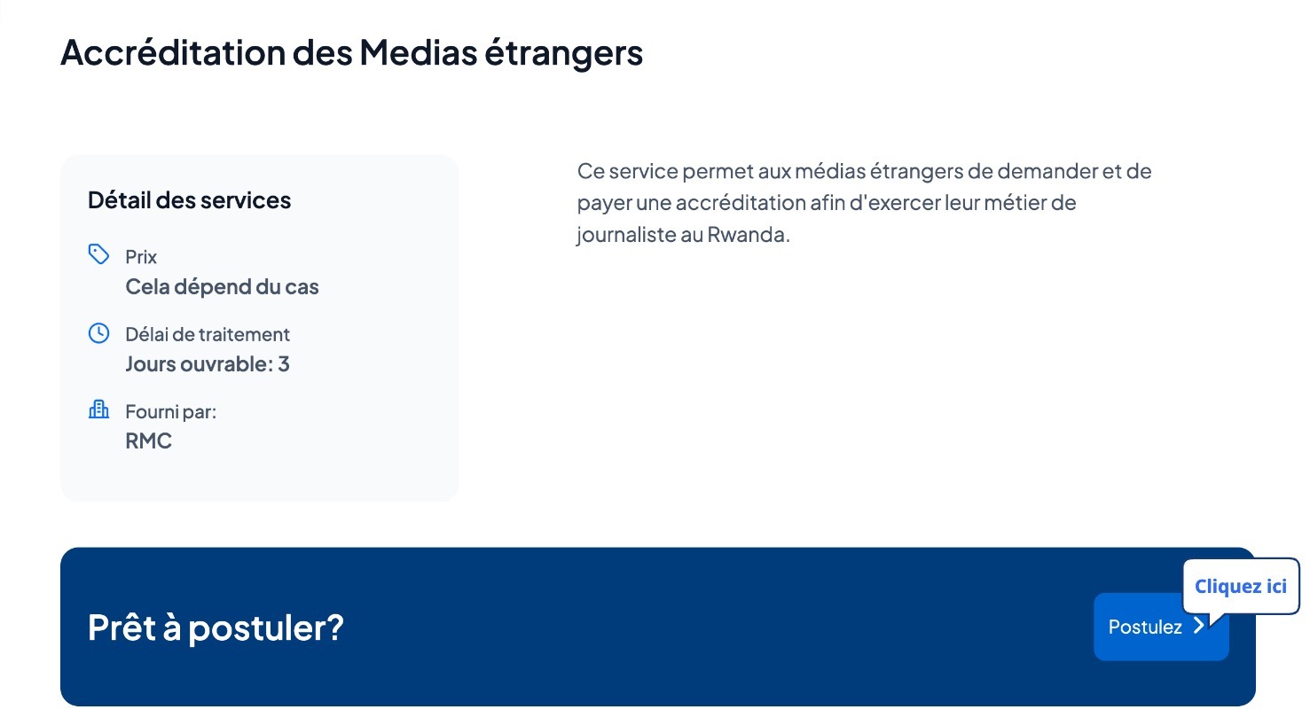 Ce service permet aux médias étrangers (correspondants rwandais, journalistes de l’EAC et journalistes étrangers) de soumettre leur demande et de payer les frais d’accréditation afin d’exercer la profession de journaliste au Rwanda.