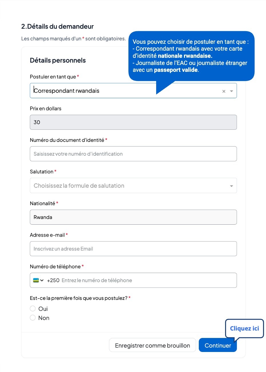 Les correspondants rwandais doivent disposer d’un numéro de carte d’identité nationale, tandis que les journalistes étrangers doivent détenir un numéro de passeport valide.