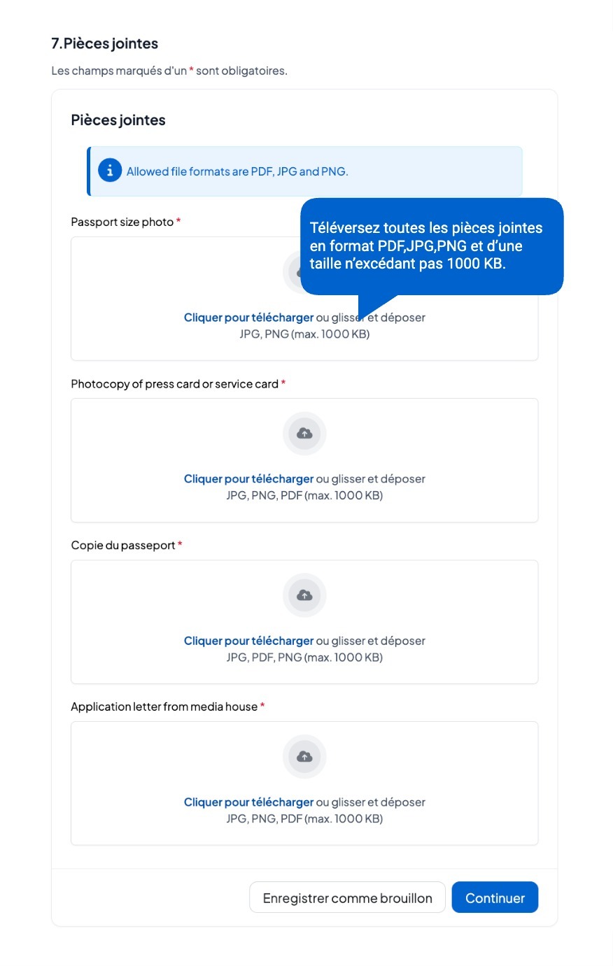 Joignez les documents requis dans le format et la taille corrects. Cliquez sur Continuer pour poursuivre.