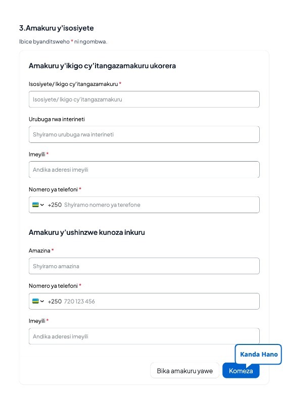 Andika amakuru y’isosiyete/ikigo nk’uko bisabwa, uyashyireho neza witonze.