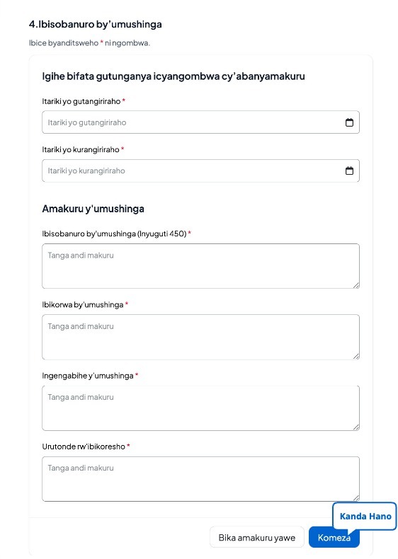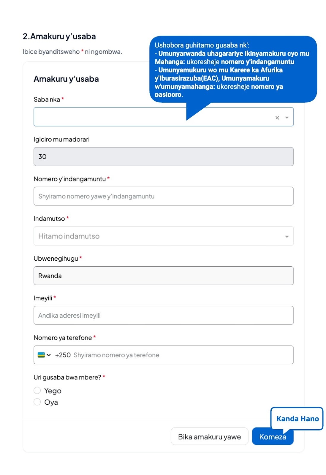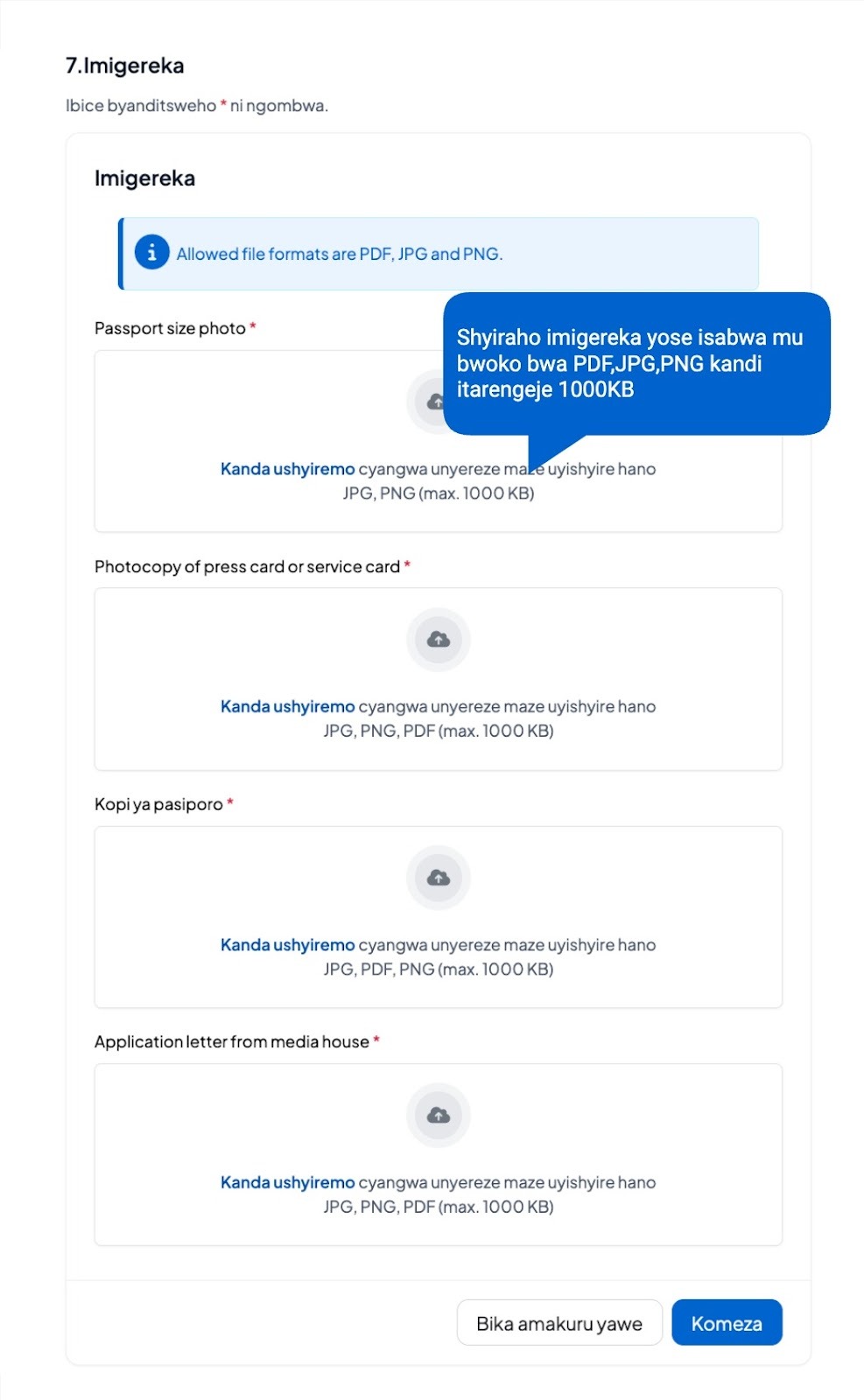 Shyiraho inyandiko zisabwa mu buryo n’ingano ikwiriye. Kanda kuri Komeza kugira ngo wohereze ubusabe bwawe.