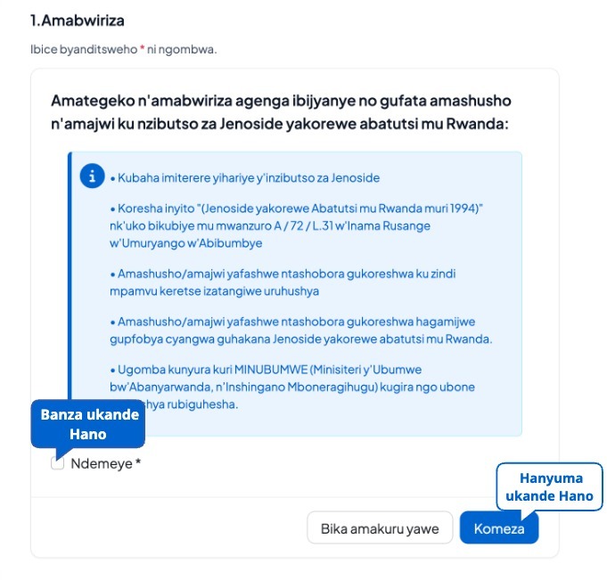 Soma witonze Amabwiriza yo gufata amashusho n’amajwi ku nzibutso za Jenoside yakorewe Abatutsi mu Rwanda, hanyuma ushyire akamenyetso mu gasanduku kemeza ko wemeye hanyuma ukande kuri Komeza kugira ngo ukomeze gusaba. Ubusabe bwawe ntibushobora gukomeza mu gihe utabyemeje muri kariya gasanduku.